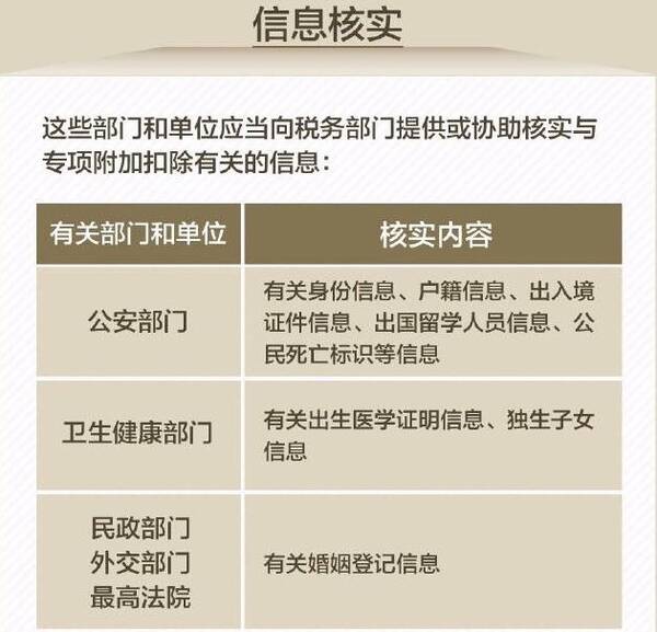 个人信息将在税务部门共享,中国将突破部门“信息孤岛”。有关部门和单位应当向税务部门提供或协助核实以下与专项附加扣除有关的信息,这包括公安部门、卫生监督部门、民政部门、外交部门、最高法院部门、教育部门等多个部门,这些信息涵盖看病、养老、上学、不动产、婚姻等方方面面。