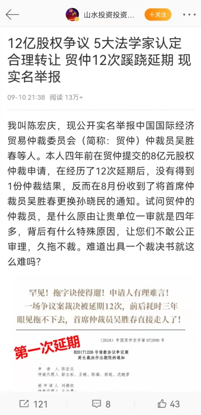 近日,陈宏庆在微博发布了头条文章:《12亿股权争议 5大法学家认定合理转让,贸仲12次蹊跷延期,现实名举报》,并且以“山水投资投资人陈宏庆”的注册名,在微博举报贸仲委12次延期争议案仲裁:“十几亿的投资,能拖拖拉拉的纠缠这么多年没个结果,匪夷所思。”