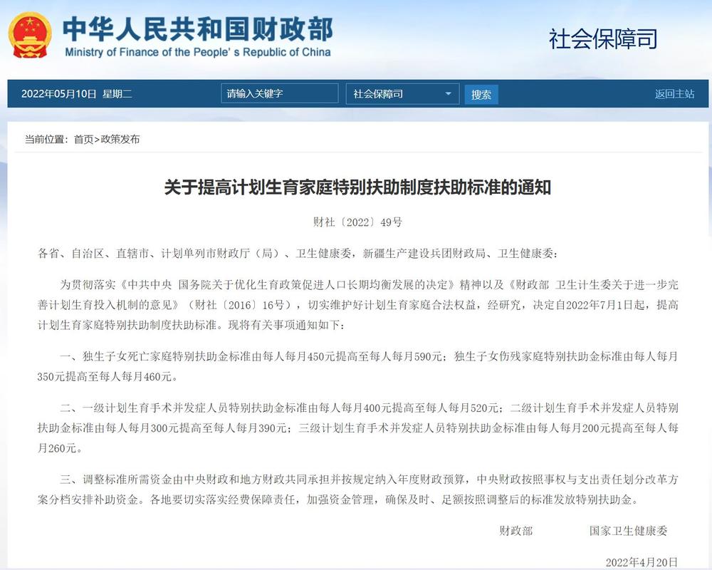 为贯彻落实《中共中央 国务院关于优化生育政策促进人口长期均衡发展的决定》精神以及《财政部 卫生计生委关于进一步完善计划生育投入机制的意见》(财社〔2016〕16号),切实维护好计划生育家庭合法权益,经研究,决定自2022年7月1日起,提高计划生育家庭特别扶助制度扶助标准。现将有关事项通知如下:
