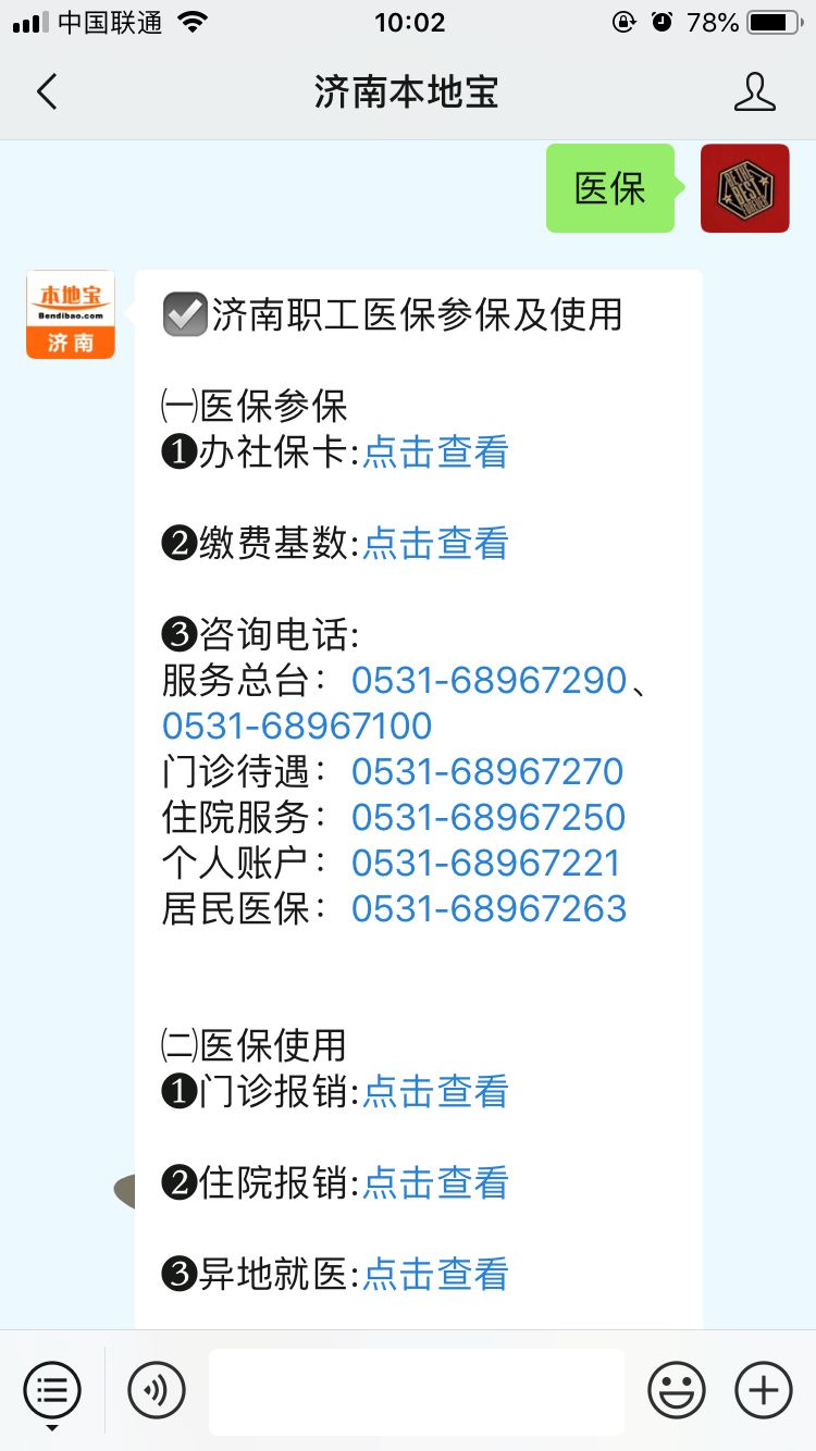 可以在济南本地宝微信对话框直接发送:医保