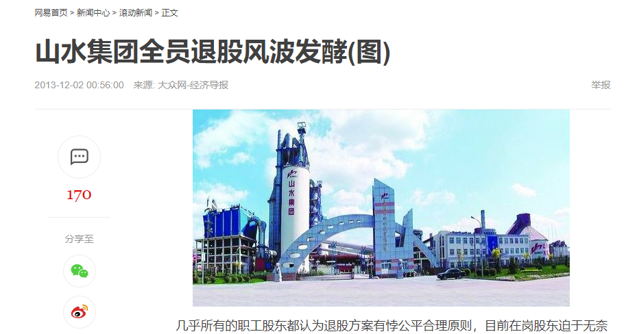彼时,由经营管理层与3939名山水集团职工组成的山水投资,为上市公司第一大股东。2013年,数千名股东组成的员工持股平台突现“退股风波”,由此开始将山水水泥股权推向猎场。