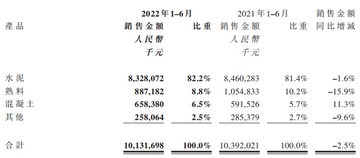 拆分结构来看,水泥是公司的收入支柱。2022年上半年,山水水泥通过销售水泥实现收入83.28亿元,占收入比重的82.2%,规模同比下滑1.6%。
